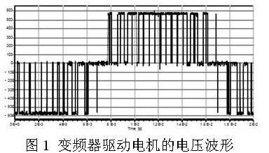 變頻器驅動電機的電壓波形并不是正弦波電壓,而是脈寬調制(PWM)電壓,如圖1所示。根據傅里葉分析,這種波形中包含了豐富的高頻成份,主要頻率成分是PWM脈沖的重復頻率,及其整倍數的頻率,PWM脈沖的重復頻率這叫做變頻器的載波頻率。