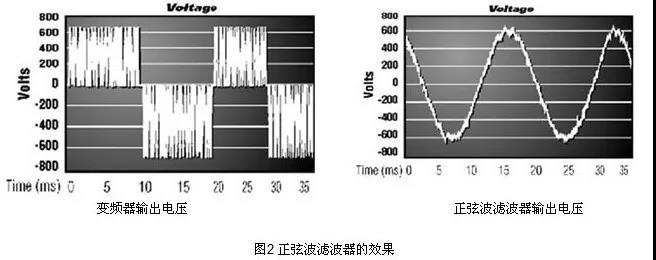 解決電機過熱的方法是減小電機驅動電壓中的高頻成份。實現這個目的方法是在變頻器的輸出端安裝SWF正弦波濾波器。正弦波濾波器將PWM電壓波形變換成適應于電機的正弦波電壓波形,如圖2所示,從而消除了電機過熱的現象。