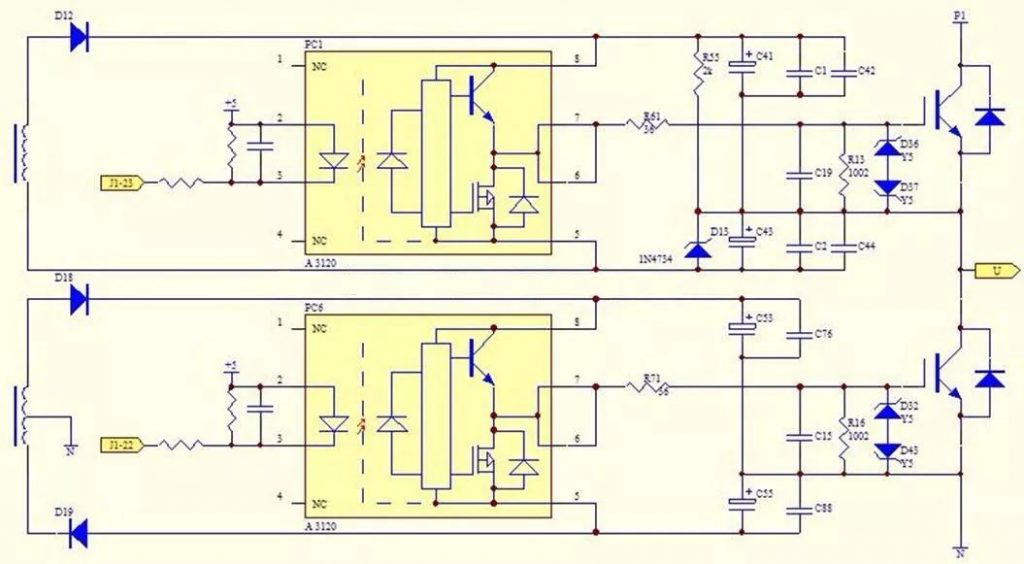 上圖是某變頻器的驅(qū)動電路U相電路圖,V、W相電路相同。從中可以看出,驅(qū)動電路的上下臂工作電源由兩組彼此隔離的電源組成,其中開關變壓器的一個繞組、D12、C41、C42、C43、C44、穩(wěn)壓二極管D13一起構成上臂驅(qū)動電路的工作電源,光耦PC1-A3120的8腳和5腳之間電壓為+20VDC,以上臂的IGBT的E極(即U相)為參考點,8腳和E之間的電壓為+15V,5腳和E之間電壓為-5V。